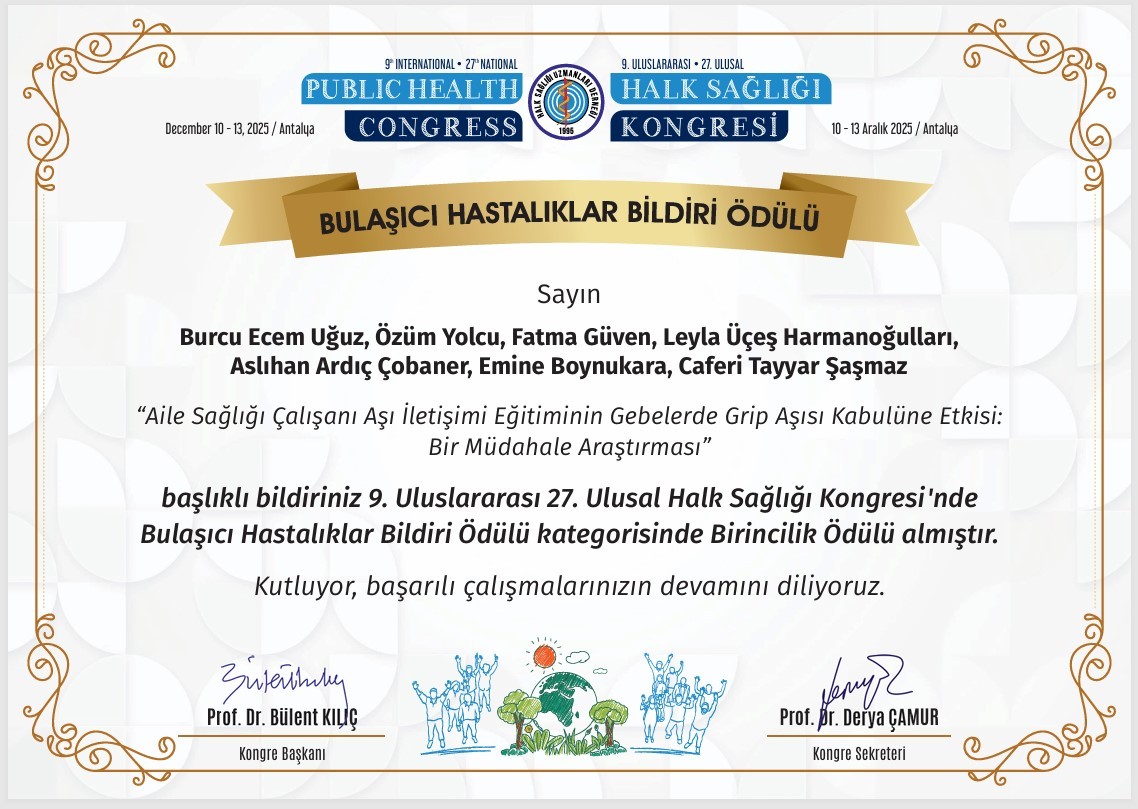 Yürütücülüğünü Üniversitemiz Tıp Fakültesi Halk Sağlığı Ana Bilim Dalı öğretim üyesi Prof. Dr. Caferi Tayyar Şaşmaz’ın yaptığı “Aile Sağlığı Çalışanı Aşı İletişimi Eğitiminin Gebelerde Grip Aşısı Kabulüne Etkisi: Bir